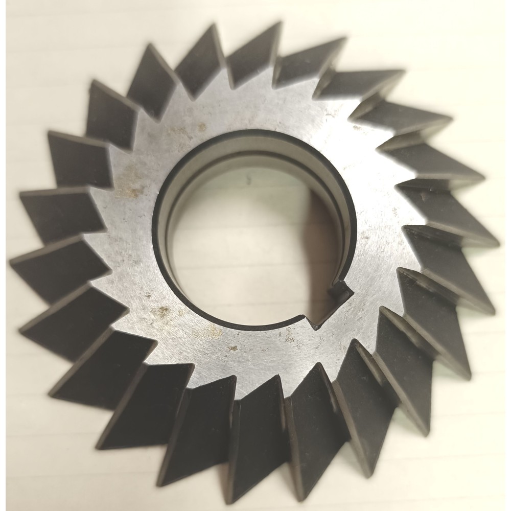 Fréza úhlová jednostranná nástrčná. Průměr 100 mm, šířka 22, vrtání 32 mm, počet zubů 22, úhel 45°. Materiál výkonná rychlořezná ocel HSS 02 CSN 222240